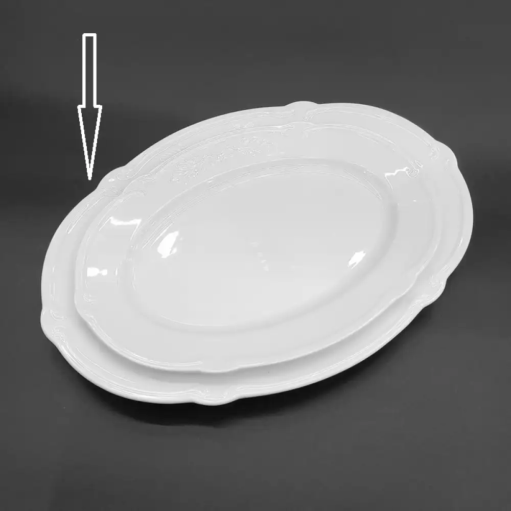 - Oval serving plate with finely carved reliefs for stylish serving of breakfast, starters, roast, desserts, or finger food.