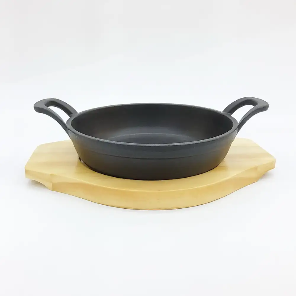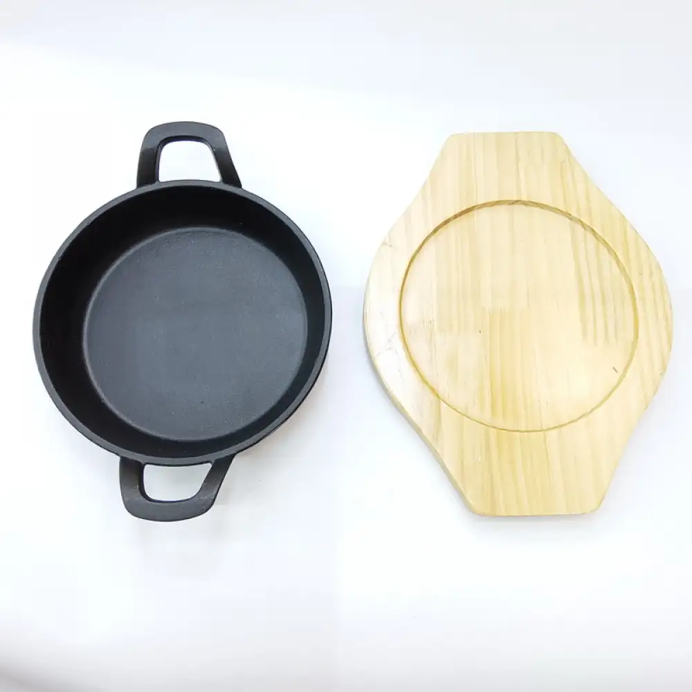 #YY185R; Cast iron pan round 18.5cm with wood tray